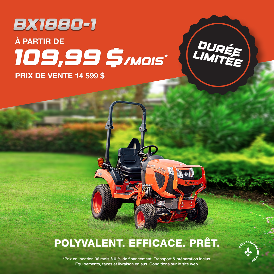 Offre de location disponible sur approbation de crédit. Exemple de location représentatif basé sur un BX1880V-1KBT neuf et non immatriculé auparavant. Le prix de location est de 14 599 $. Taux de location de 0 % (taux effectif de 2,87 %) pendant 36 mois. Le paiement mensuel de location est de 109,99 $ et comprend : 470,19 $ en frais de transport; les frais réglementaires (jusqu'à 3,72 $); les frais d’inscription d’un droit (jusqu'à 391,00 $, y compris les frais de l'agent d’inscription); ainsi que tous les autres frais, droits et redevances applicables (qui peuvent tous varier selon la région et le concessionnaire). Les assurances, l'immatriculation et les taxes de vente applicables sont en sus. Acompte de 1 559 $ ou valeur de reprise équivalente et dépôt de garantie de 0,00 $ dus au début du contrat de location. L'obligation totale de location est de 3 959,64 $. Total de 36 paiements mensuels requis pendant la durée du contrat de location. Allocation de 150 heures; frais de 25,00 $/h pour les heures supplémentaires. Le concessionnaire peut louer à un prix inférieur. Une commande ou un échange du concessionnaire peut être nécessaire (mais peut ne pas être disponible dans tous les cas). L'offre prend fin le 30 juin 2026 et peut être modifiée ou annulée sans préavis. Consultez votre concessionnaire Kubota participant.